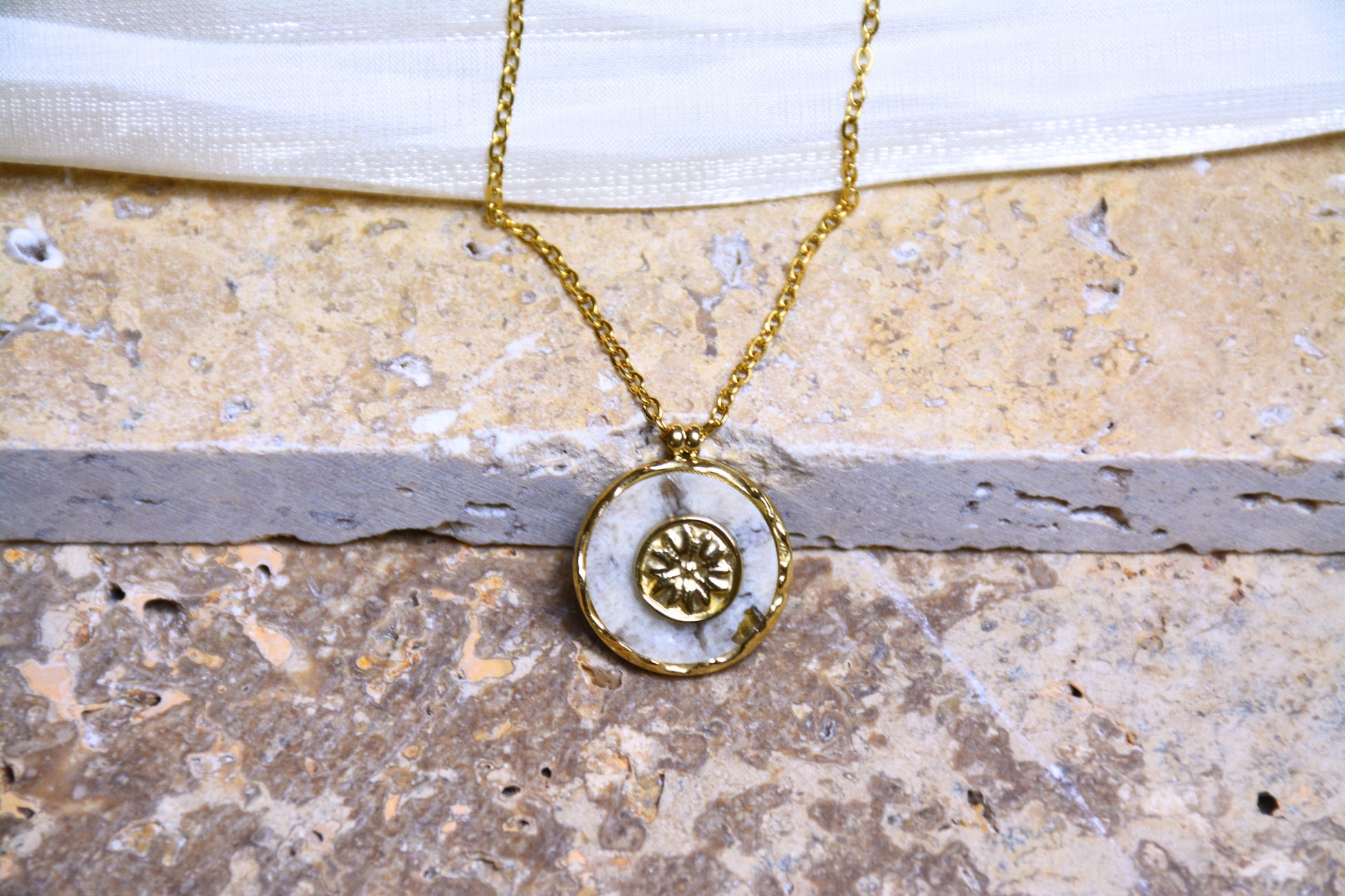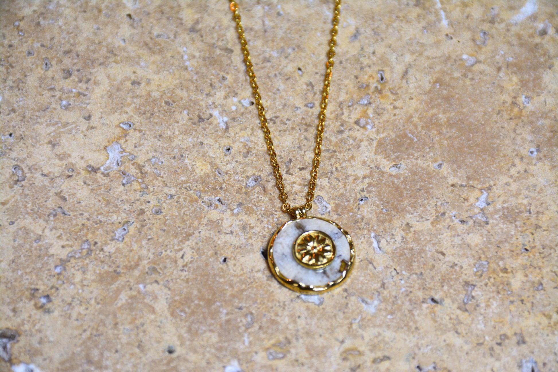 Inspiré de l’étoile Vega, l’une des plus lumineuses du ciel, ce collier révèle l’éclat mystérieux du marbre délicatement cerclé d’or. Un bijou puissant, symbole de lumière, d’élégance et d’énergie céleste.